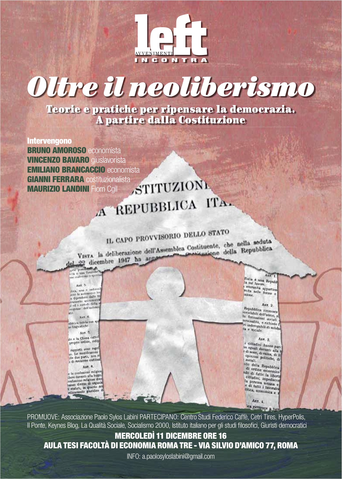 La Costituzione come antitesi essenziale ai princìpi del neoliberismo economico, che ci hanno condotto dentro la crisi e che continuano ad aggravarla giorno dopo giorno, smantellando progressivamente i fondamenti della vita democratica. È dedicato a questo tema il convegno annuale dell’Associazione Paolo Sylos Labini, in questa occasione organizzato insieme al settimanale left. Costituzionalisti, esperti di diritto, economisti, si confronternanno sui diritti fondamen- tali della Costituzione, a partire dai princìpi di ugua- glianza (sostanziale) e di esistenza libera e dignitosa, sui quali si fonda il diritto al lavoro; sulle caratteristi- che del paradigma liberista che negano l’esistenza di tali diritti; sulla crisi della rappresentanza politica come effetto delle ricadute del paradigma neoliberi- sta sulla sovranità degli Stati e conseguentemente sul sistema democratico; infine sul ruolo dell’attore pubblico informato nei princìpi base della Costituzio- ne, a partire dalla definizione degli obiettivi ultimi di politica economica: piena e buona occupazione per una società giusta e democratica. La crisi economica dimostra la necessità di una nuova programmazione in alternativa alle politiche neoliberiste, in attuazione dei principi fondamentali della Costituzione, capace al tempo stesso di farsi interprete delle domande più urgenti che il presente ci pone.