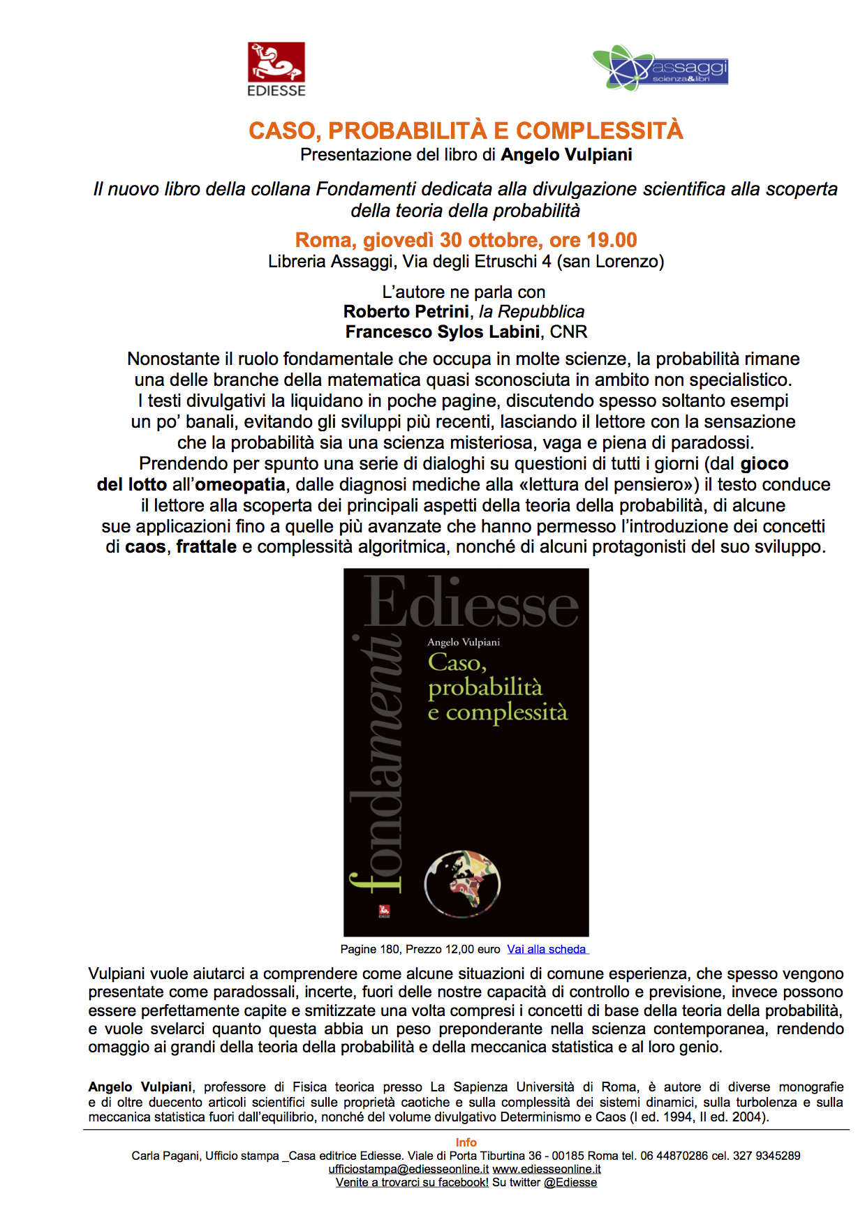 Angelo Vulpiani, professore di Fisica teorica presso La Sapienza Università di Roma, è autore di diverse monografiee di oltre duecento articoli scientifici sulle proprietà caotiche e sulla complessità dei sistemi dinamici, sulla turbolenza e sulla meccanica statistica fuori dall’equilibrio, nonché del volume divulgativo Determinismo e Caos (I ed. 1994, II ed. 2004).