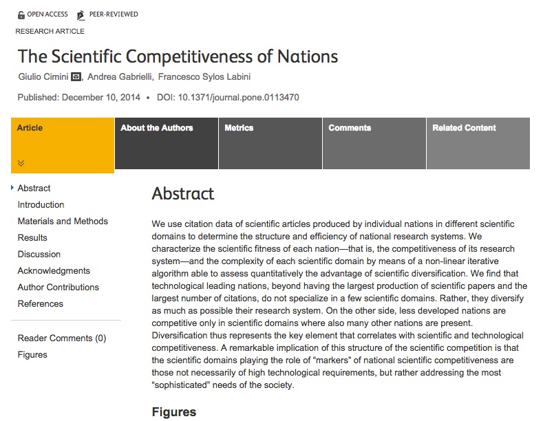 The Scientific Competitiveness of Nations December 10, 2014Highlights on physics papers, Science PolicyAndrea Gabrielli, Giulio Ciminifsyloslab By Giulio Cimini, Andrea Gabrielli, Francesco Sylos Labini Published: December 10, 2014 DOI: 10.1371/journal.pone.0113470 “Diversification thus represents the key element that correlates with scientific and technological competitiveness.” Share this: Click to share on X (Opens in new window) X Click to share on Facebook (Opens in new window) Facebook Like Loading...