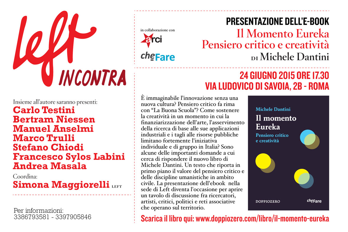 Ci può essere innovazione senza una nuova cultura?Il pensiero critico, l’arte, la ricerca e le discipline umanistiche possono essere la chiave di volta per la ripresa del Paese. Se ne parla nella redazione di Left, il 24 giugno. A partire dal nuovo libro di Michele Dantini, Il momento Eureka, edito da Doppiozero/Che fare. Con l’autore ci saranno Carlo Testini, e Marco Trullidell’Arci, Francesco Sylos Labini di Redazione Roars, #BertramNiessen,#ManuelAnselmi, #AndreaMasala, #StefanoChiodi e molti altri