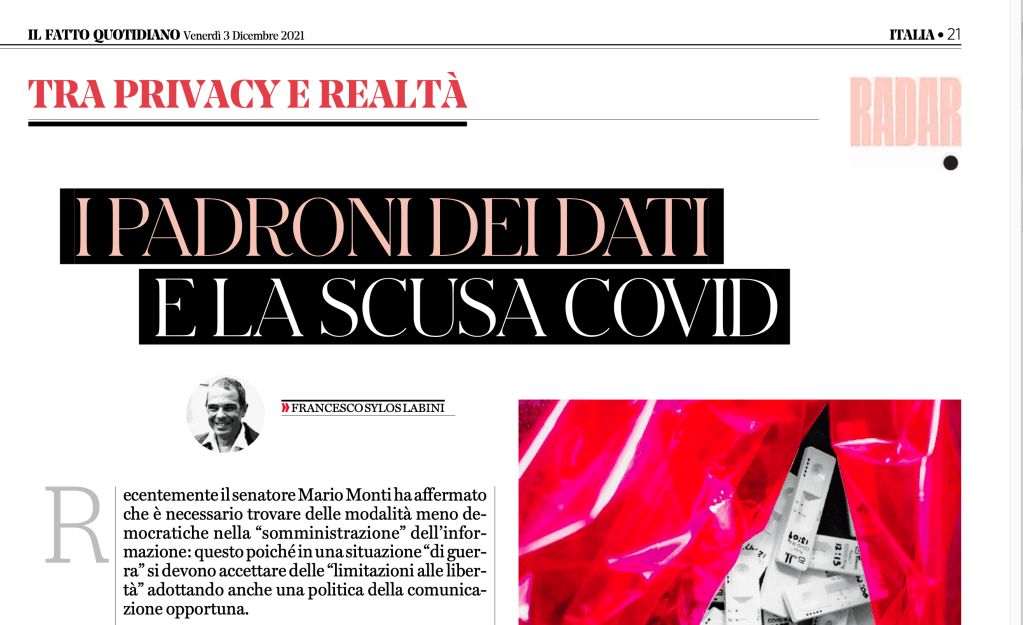 I dati riguardanti sanità pubblica non servono solo a fornire la basa razionale per i modelli previsionali ma anche per facilitare le scelte dei cittadini. È ormai assodato che l’unica maniera di contrastare il dissenso vaccinale che si è diffuso tra i cittadini è attraverso una informazione indipendente dalle fonti governative ufficiali, ma basata sullo stato dell’arte delle conoscenze fornite dalla comunità scientifica, che possa far superare la percezione di un pensiero unico che discende dall’autorità politica. Soprattutto la democrazia e la pacifica convivenza si fondano sulla controllabilità delle asserzioni di chi esercita il potere: il consenso si genera perché pensiamo che stiamo lavorando su una base razionale condivisibile e lo Stato democratico si basa sul principio di pubblicità ovvero di un potere visibile basato su un dato trasparente; l’adesione alle proposte di prevenzione dipende soprattutto dal consenso sui dati oggettivi. Per questo l’attenzione ai dati è il primo e cruciale elemento per contrastare il dosaggio dell’informazione nella distopica realtà immaginata da Monti.
