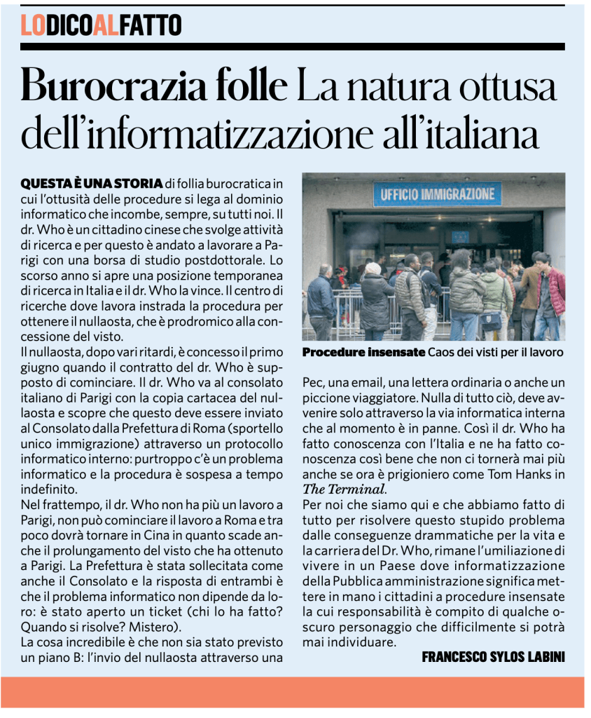 This is a story of bureaucratic madness in which the obtuseness of procedures is linked to the IT domain that looms, always, over us all. Dr. Who is a Chinese citizen doing research and went to work in Paris on a post-doctoral fellowship. Last year, a temporary research position opened up in Italy and Dr Who won it. The research centre where he works instigates the procedure to obtain the nulla osta that is prodromal to the granting of the visa. The Nulla Osta, after various delays, is granted on 1 June when Dr. Who’s contract is supposed to begin. Dr. Who goes to the Italian consulate in Paris with the hard copy of the nulla osta and discovers that it must be sent to the consulate by the Prefecture of Rome (single immigration desk) via an internal computer protocol: unfortunately there is a computer problem and the procedure is suspended indefinitely. In the meantime, Dr. Who no longer has a job in Paris, cannot start work in Rome and will soon have to return to China as the extension of the visa he obtained in Paris also expires. The prefecture has been asked, as has the consulate, and the answer from both is that the computer problem is not their fault: a ticket has been opened (who did it? When will it be resolved? Mystery). The incredible thing is that there is no plan B: sending the Nulla Osta via a PEC, an email, an ordinary letter or even a carrier pigeon. None of this, it has to be done only via the internal IT route, which is currently broken down. So Dr. Who got to know Italy and got to know it so well that he will never go back, even if he is now a prisoner like Tom Hanks in ‘The Terminal’. For those of us who are here and have done everything we can to solve this stupid problem with dramatic consequences for Dr. Who’s life and career, there remains the humiliation of living in a country where the computerisation of public administration means putting citizens in the hands of nonsensical procedures whose responsibility lies with some obscure personage who can hardly ever be identified.