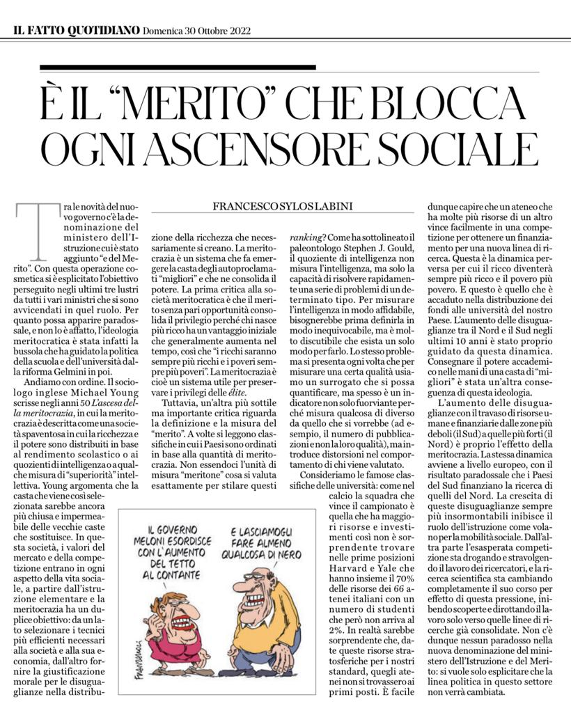 L’aumento delle disuguaglianze con il travaso di risorse umane e finanziarie dalle zone più deboli (il Sud) a quelle più forti (il Nord) è proprio l’effetto della meritocrazia. La stessa dinamica avviene a livello europeo, con il risultato paradossale che i Paesi del Sud finanziano la ricerca di quelli del Nord. La crescita di queste disuguaglianze sempre più insormontabili inibisce il ruolo dell’istruzione come volano per la mobilità sociale. Dall’altra parte l’esasperata competizione sta drogando e stravolgendo il lavoro dei ricercatori, e la ricerca scientifica sta cambiando completamente il suo corso per effetto di questa pressione, inibendo scoperte e dirottando il lavoro solo verso quelle linee di ricerche già consolidate. Non c’è dunque nessun paradosso nella nuova denominazione del ministero dell’Istruzione e del Merito: si vuole solo esplicitare che la linea politica in questo settore non verrà cambiata.