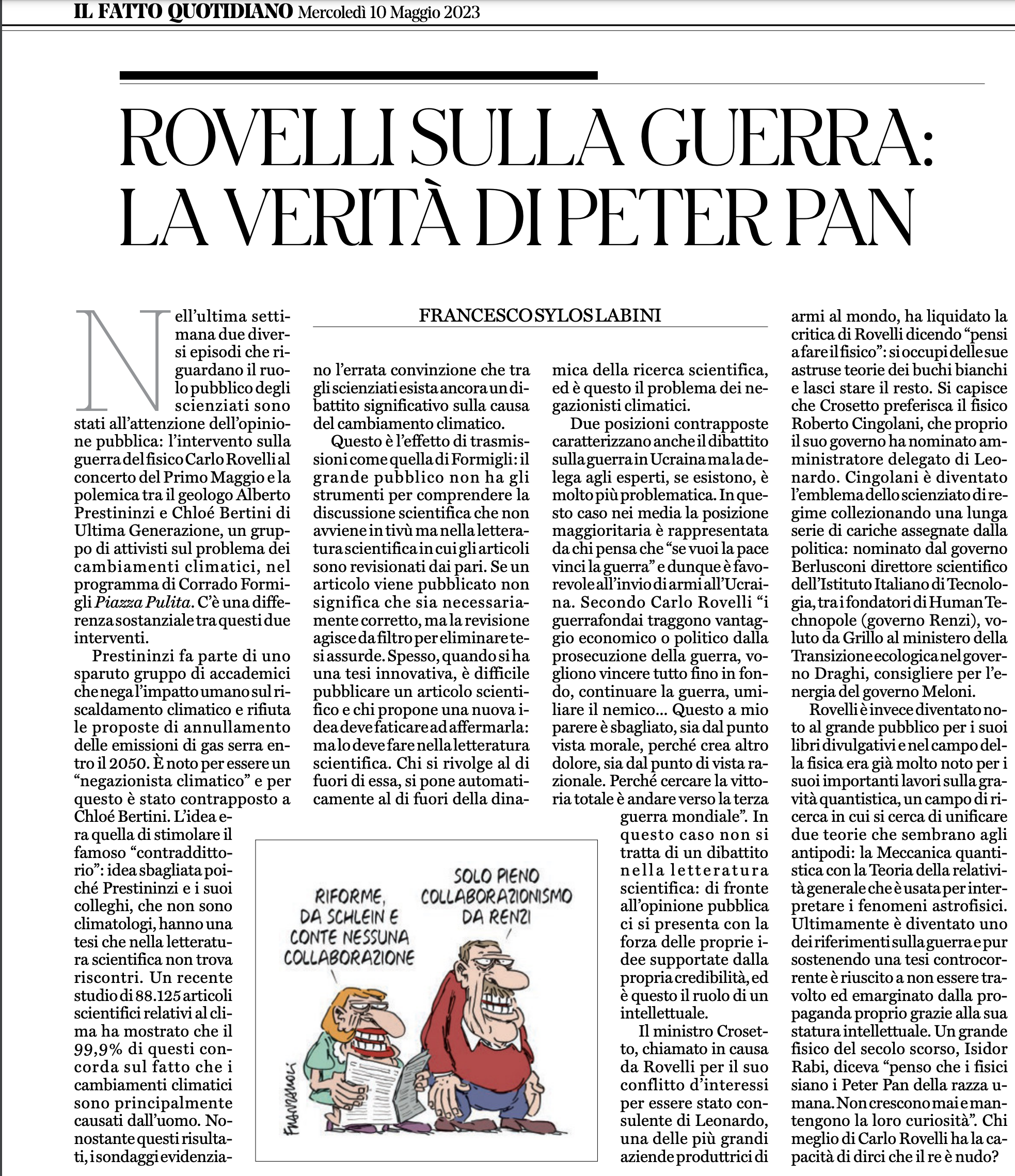 Il ministro Crosetto, chiamato in causa da Rovelli per il suo conflitto d’interessi per essere stato consulente di Leonardo, una delle più grandi aziende produttrici di armi al mondo, ha liquidato la critica di Rovelli dicendo “pensi a fare il fisico”: si occupi delle sue astruse teorie dei buchi bianchi e lasci stare il resto. Si capisce che Crosetto preferisca il fisico Roberto Cingolani, che proprio il suo governo ha nominato amministratore delegato di Leonardo. Cingolani è diventato l’emblema dello scienziato di regime collezionando una lunga serie di cariche assegnate dalla politica: nominato dal governo Berlusconi direttore scientifico dell’Istituto Italiano di Tecnologia, tra i fondatori di Human Technopole (governo Renzi), voluto da Grillo al ministero della transizione ecologica nel governo Draghi, consigliere per l’energia del Governo Meloni.