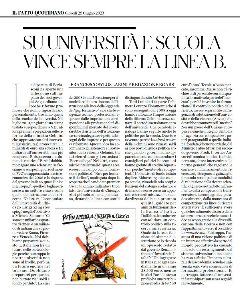 La dipartita di Berlusconi ha aperto una riflessione sull’impatto dei suoi governi. Se guardiamo alle poche riforme promosse che non lo riguardavano personalmente, troviamo quelle della scuola e dell’università. Nel luglio 2010, un giornalista di una testata europea chiese a S.B., allora premier, spiegazioni sulle riforme della Ministra Gelmini che, approvate con altri interventi legislativi, tagliarono circa 8,5 miliardi di euro alla scuola e 1,3 miliardi all’università, mai più recuperati. B. rispose con una domanda retorica: “perché dobbiamo pagare uno scienziato se facciamo le scarpe migliori del mondo?”.