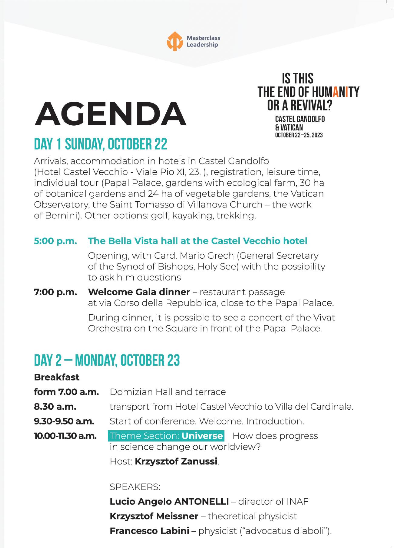Ho avuto l’onore di essere invitato al convegno IS THIS THE END OF HUMANITY 0R A REVIVAL? che si terrà a Castel Gandolfo & al Vaticano. In particolare parteciperò alla sessione “How does progress in science change our worldview” dove svolgerò il ruolo di “advocatus diaboli”,