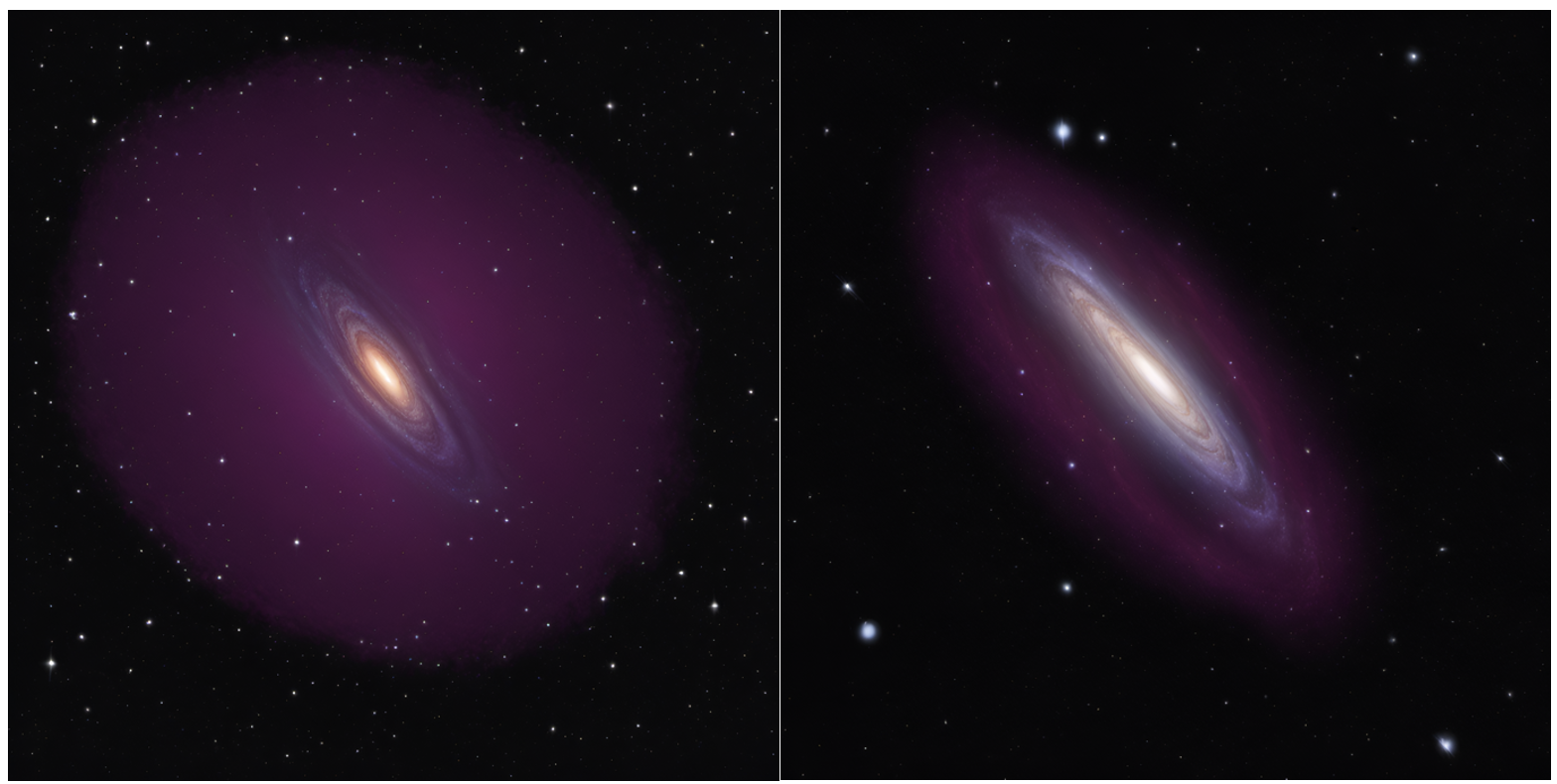 Il pannello sinistro illustra il modello dell’alone standard, in cui la materia oscura è distribuita in un alone sferico che circonda e comprende un disco galattico. In questo modello, la materia oscura si estende in tutta la regione dell’alone. Il pannello destro rappresenta il modello del disco di materia oscura, in cui la materia oscura è confinata principalmente all’interno del disco galattico e la sua distribuzione è tracciata dalla distribuzione dell’idrogeno neutro. In questo modello, la materia oscura è concentrata all’interno del disco ed è dedotta dalle proprietà osservate dell’idrogeno neutro. Questi due pannelli rappresentano visivamente le diverse ipotesi e distribuzioni di materia oscura nei due modelli: il modello dell’alone standard assume una distribuzione sferica attorno al disco galattico, mentre il modello del disco di materia oscura propone che la materia oscura risieda principalmente all’interno del disco stesso.