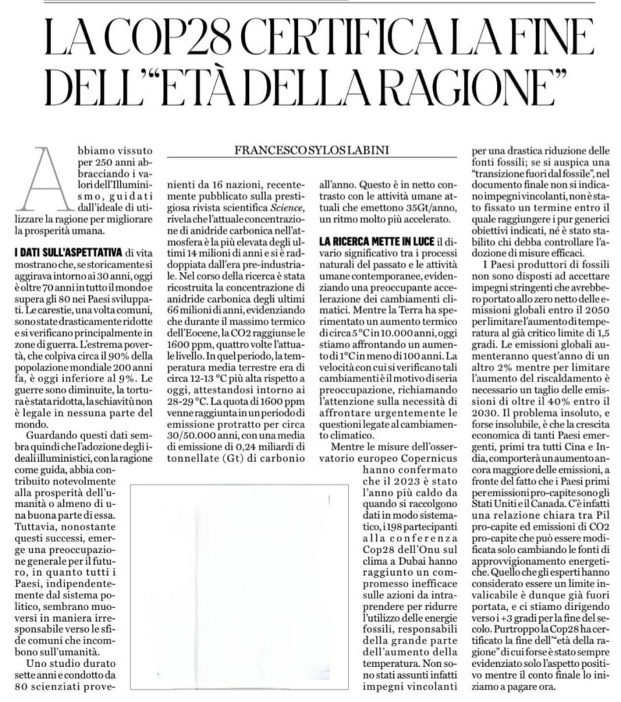 Guardando questi dati sembra quindi che l’adozione degli ideali illuministici, con la ragione come guida, abbia contribuito notevolmente alla prosperità dell’umanità o almeno di una buona parte di essa. Tuttavia, nonostante questi successi, emerge una preoccupazione generale per il futuro, in quanto tutti i Paesi, indipendentemente dal sistema politico, sembrano muoversi in maniera irresponsabile verso le sfide comuni che incombono sull’umanità.