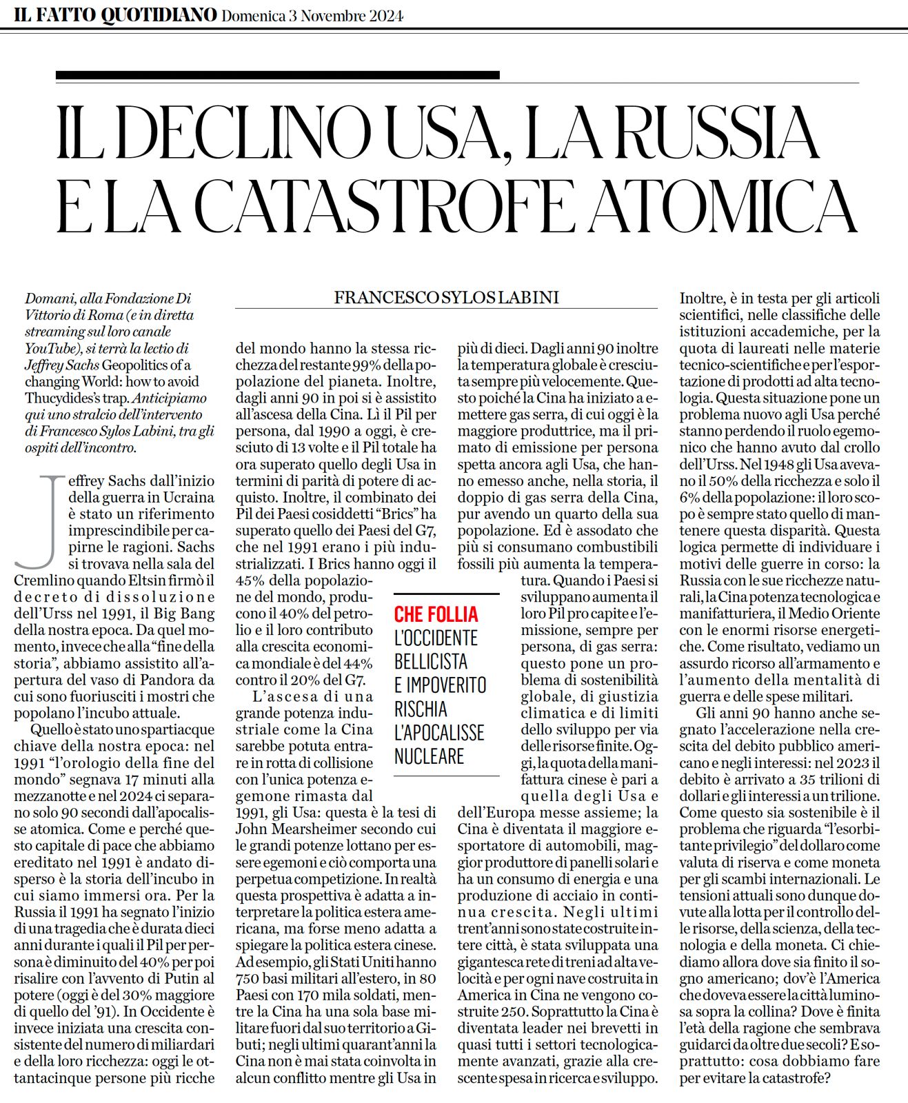 Domani, alla Fondazione Di Vittorio di Roma (e in diretta streaming sul loro canale YouTube), si terrà la lectio di Jeffrey Sachs Geopolitics of a changing World: how to avoid Thucydides’s trap. Anticipiamo qui uno stralcio dell’intervento di Francesco Sylos Labini, tra gli ospiti dell’incontro.