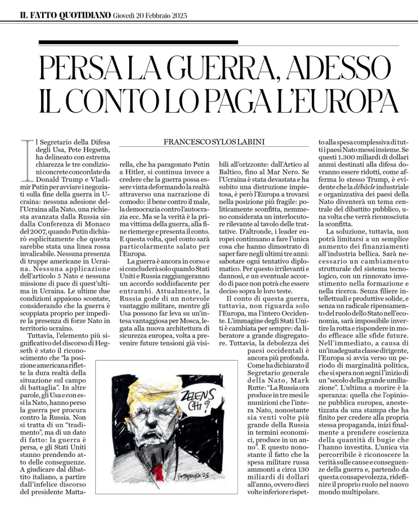 Tuttavia, l’elemento più significativo del discorso di Hegseth è stato il riconoscimento che “la posizione americana riflette la dura realtà della situazione sul campo di battaglia”. In altre parole, gli Usa e con essi la Nato, hanno perso la guerra per procura contro la Russia. Non si tratta di un “tradimento”, ma di un dato di fatto: la guerra è persa, e gli Stati Uniti stanno prendendo atto delle conseguenze. A giudicare dal dibattito italiano, a partire dall’infelice discorso del presidente Mattarella, che ha paragonato Putin a Hitler, si continua invece a credere che la guerra possa essere vinta deformando la realtà attraverso una narrazione di comodo: il bene contro il male, la democrazia contro l’autocrazia ecc. Ma se la verità è la prima vittima della guerra, alla fine riemerge e presenta il conto. E questa volta, quel conto sarà particolarmente salato per l’Europa.