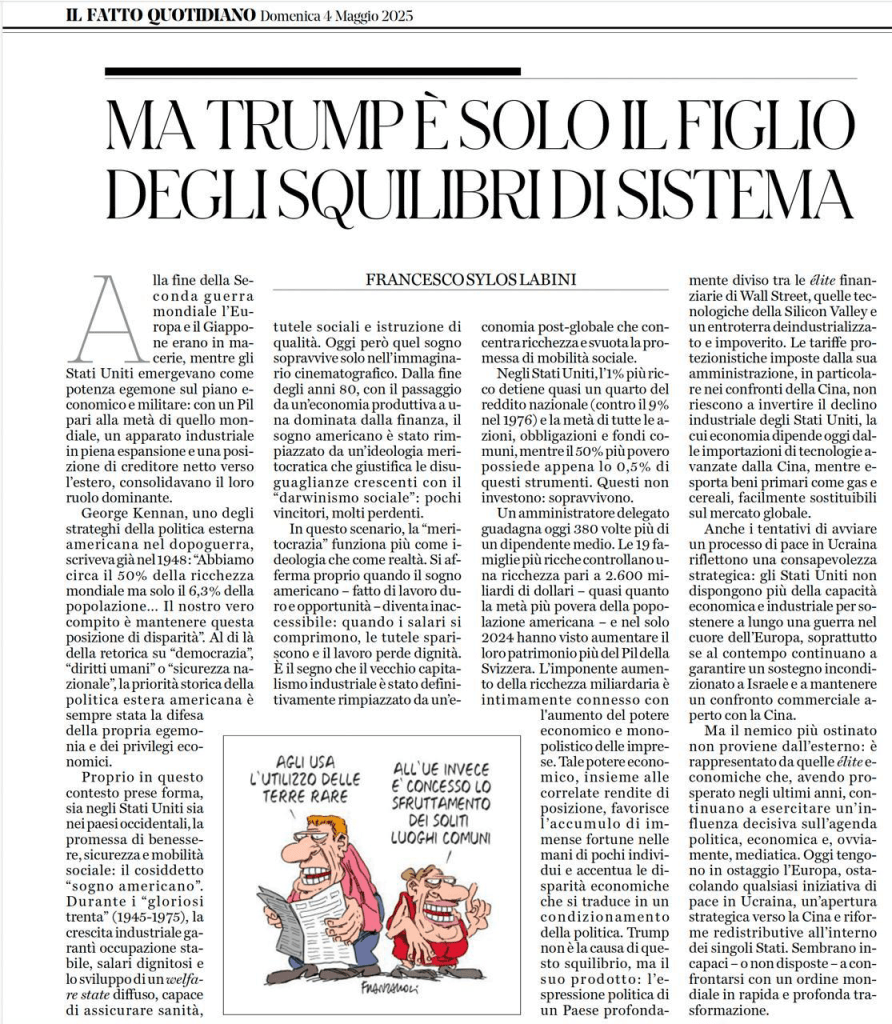 Un amministratore delegato guadagna oggi 380 volte più di un dipendente medio. Le 19 famiglie più ricche controllano una ricchezza pari a 2.600 miliardi di dollari – quasi quanto la metà più povera della popolazione americana – e nel solo 2024 hanno visto aumentare il loro patrimonio più del Pil della Svizzera. L’imponente aumento della ricchezza miliardaria è intimamente connesso con l’aumento del potere economico e monopolistico delle imprese. Tale potere economico, insieme alle correlate rendite di posizione, favorisce l’accumulo di immense fortune nelle mani di pochi individui e accentua le disparità economiche che si traduce in un condizionamento della politica. Trump non è la causa di questo squilibrio, ma il suo prodotto: l’espressione politica di un Paese profondamente diviso tra le élite finanziarie di Wall Street, quelle tecnologiche della Silicon Valley e un entroterra deindustrializzato e impoverito. Le tariffe protezionistiche imposte dalla sua amministrazione, in particolare nei confronti della Cina, non riescono a invertire il declino industriale degli Stati Uniti, la cui economia dipende oggi dalle importazioni di tecnologie avanzate dalla Cina, mentre esporta beni primari come gas e cereali, facilmente sostituibili sul mercato globale.