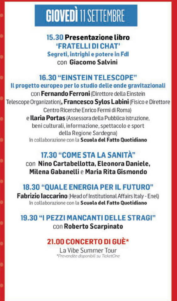Giovedì 11 settembre alla festa del @fattoquotidiano avrò il piacere di chiacchierare con Nando Ferroni e l’assessora Portas sul progetto del telescopio Einstein per rilevare onde gravitazionali