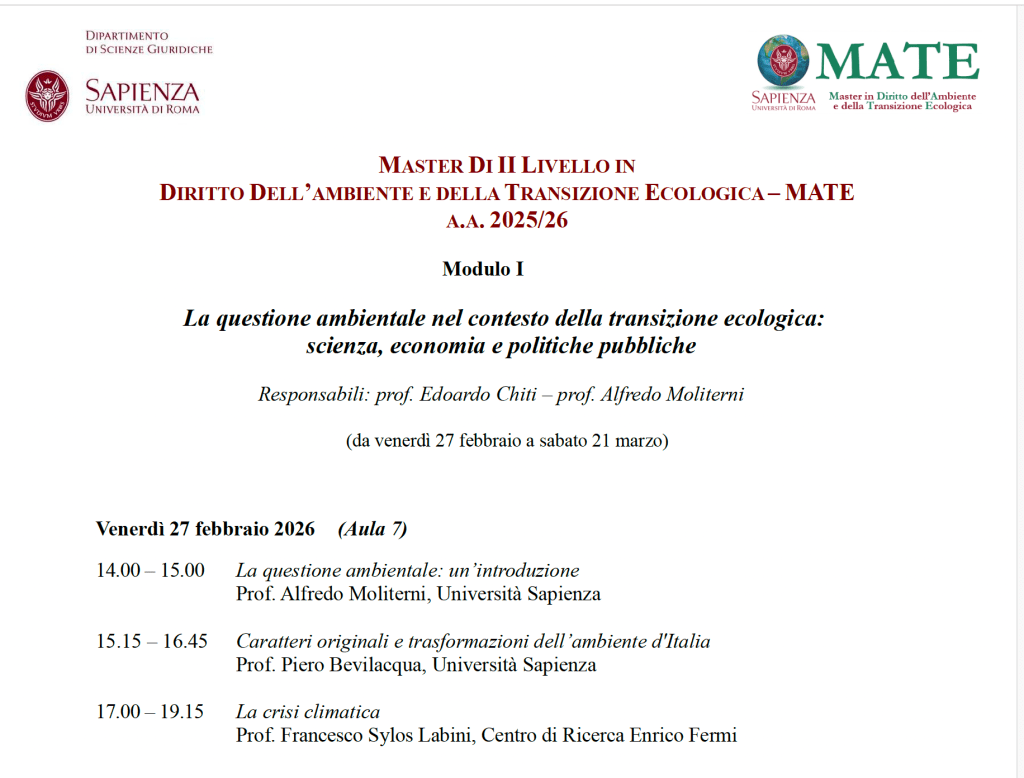 Nell’ambito del Master in diritto dell’ambiente e della transizione ecologica che si terrà presso la Facoltà di Giurisprudenza – Sapienza Università di Roma terrò una lezione sul tema “La Crisi Climatica”