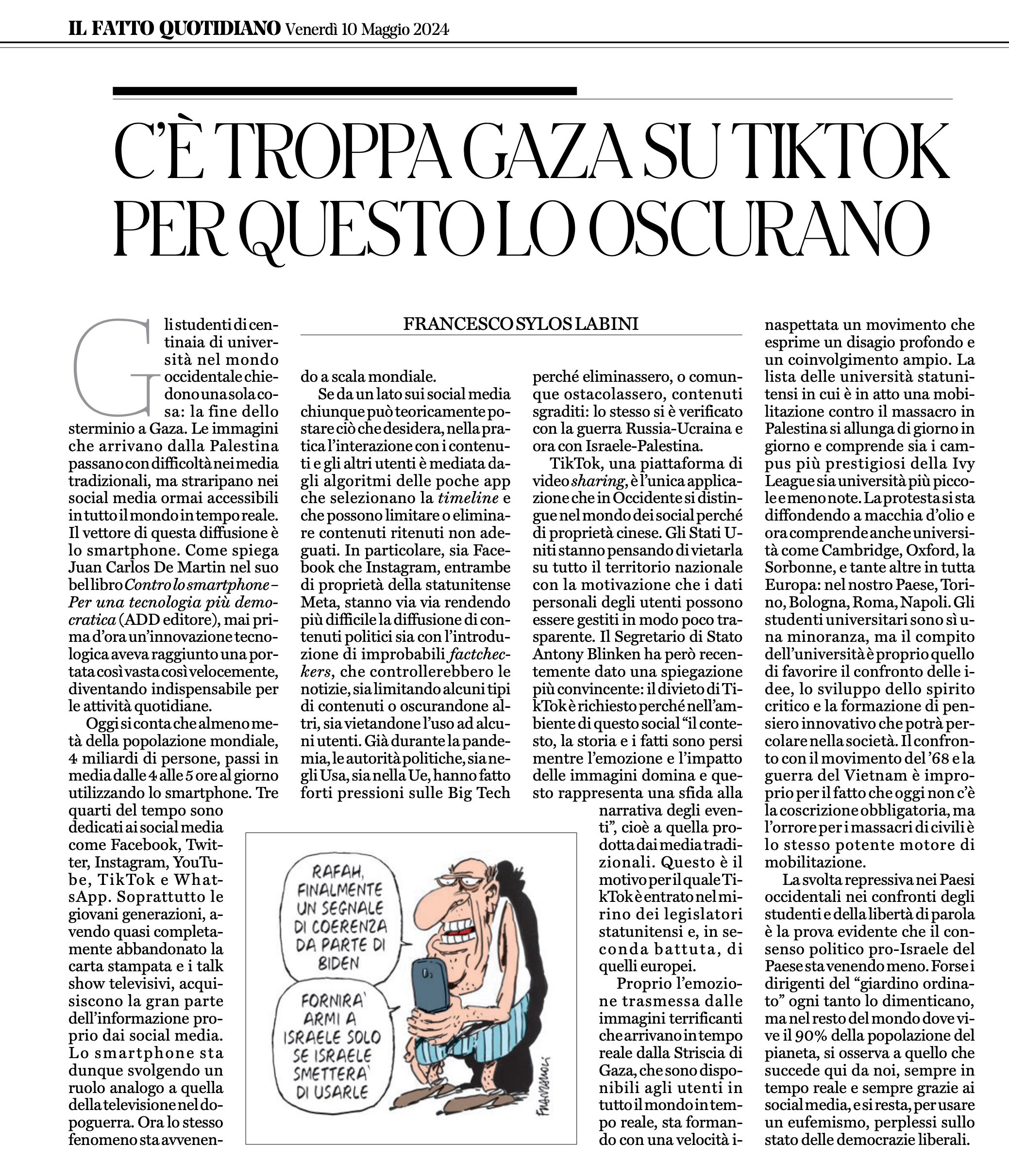 Students from hundreds of universities in the Western world are demanding one thing: an end to the massacre in Gaza. The images coming from Palestine face difficulties in traditional media but overflow on social media platforms accessible worldwide in real-time. The vector of this dissemination is the smartphone. As Juan Carlos De Martin explains in his insightful book “Against the Smartphone – Towards a more democratic technology” (ADD Publisher), never before has a technological innovation reached such a vast scale so rapidly, becoming indispensable for daily activities.