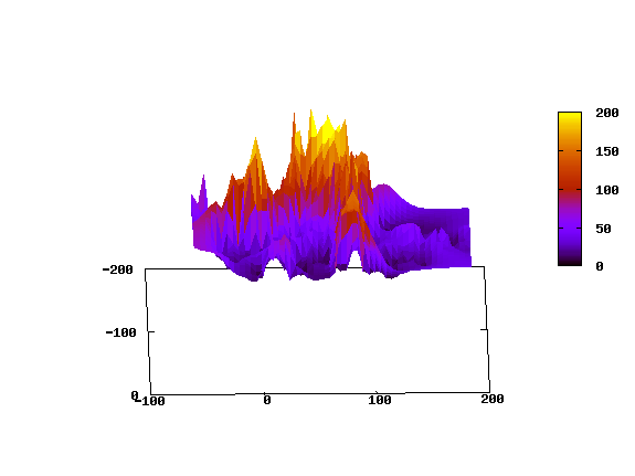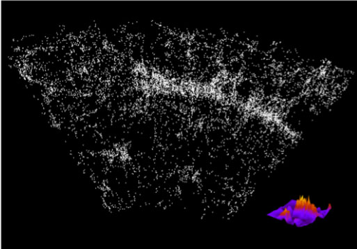 Below there is a reconstruction of the three dimensional fluctuation field in the SDSS survey. A larger scale structure, the Great Wall in this case, appears as a mountain chain, i.e a spatially extended structure.