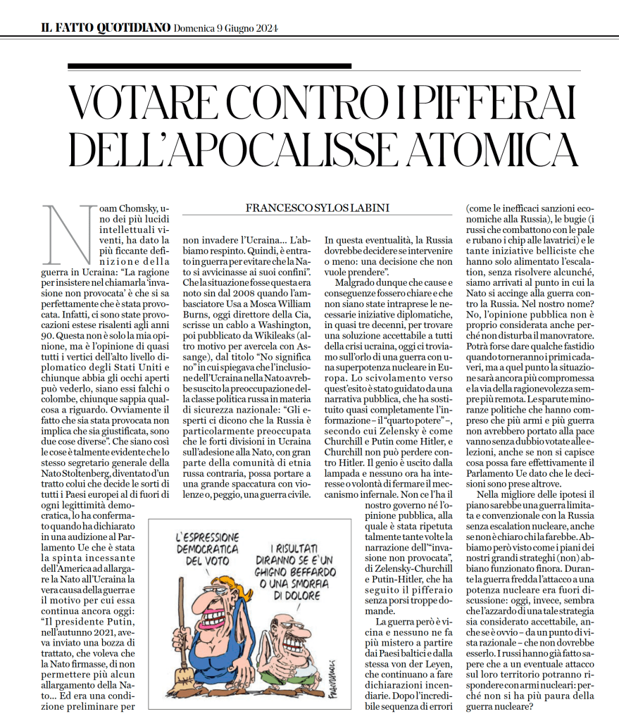 Noam Chomsky, uno dei più lucidi intellettuali viventi, ha dato la più ficcante definizione della guerra in Ucraina: “La ragione per insistere nel chiamarla ‘invasione non provocata’ è che si sa perfettamente che è stata provocata. Infatti, ci sono state provocazioni estese risalenti agli anni 90. Questa non è solo la mia opinione, ma è l’opinione di quasi tutti i vertici dell’alto livello diplomatico degli Stati Uniti e chiunque abbia gli occhi aperti può vederlo, siano essi falchi o colombe, chiunque sappia qualcosa a riguardo. Ovviamente il fatto che sia stata provocata non implica che sia giustificata, sono due cose diverse”. Che siano così le cose è talmente evidente che lo stesso segretario generale della Nato Stoltenberg, diventato d’un tratto colui che decide le sorti di tutti i Paesi europei al di fuori di ogni legittimità democratica, lo ha confermato quando ha dichiarato in una audizione al Parlamento Ue che è stata la spinta incessante dell’America ad allargare la Nato all’Ucraina la vera causa della guerra e il motivo per cui essa continua ancora oggi: “Il presidente Putin, nell’autunno 2021, aveva inviato una bozza di trattato, che voleva che la Nato firmasse, di non permettere più alcun allargamento della Nato… Ed era una condizione preliminare per non invadere l’Ucraina… L’abbiamo respinto. Quindi, è entrato in guerra per evitare che la Nato si avvicinasse ai suoi confini”. Che la situazione fosse questa era noto sin dal 2008 quando l’ambasciatore Usa a Mosca William Burns, oggi direttore della Cia, scrisse un cablo a Washington, poi pubblicato da Wikileaks (altro motivo per avercela con Assange), dal titolo “No significa no” in cui spiegava che l’inclusione dell’Ucraina nella Nato avrebbe suscito la preoccupazione della classe politica russa in materia di sicurezza nazionale: “Gli esperti ci dicono che la Russia è particolarmente preoccupata che le forti divisioni in Ucraina sull’adesione alla Nato, con gran parte della comunità di etnia russa contraria, possa portare a una grande spaccatura con violenze o, peggio, una guerra civile. In questa eventualità, la Russia dovrebbe decidere se intervenire o meno: una decisione che non vuole prendere”.