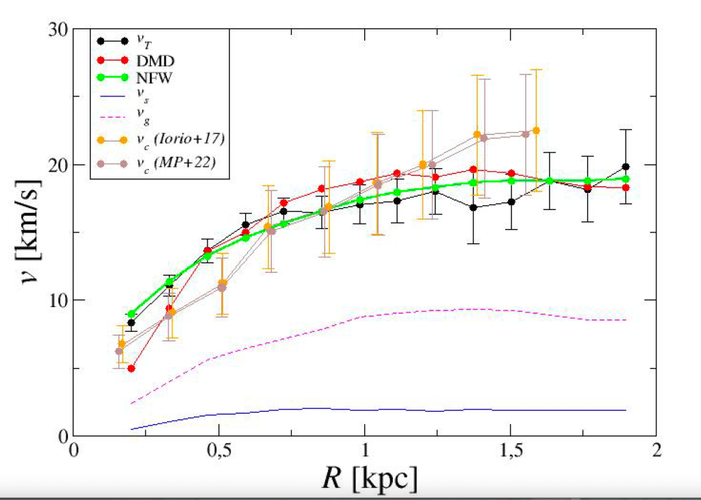 ABSTRACT We conducted an analysis of the velocity field of dwarf galaxies in the LITTLE THINGS sample, focusing on deriving 2D velocity maps that encompass both the transverse and radial velocity fields. Within the range of radial distances where velocity anisotropies are sufficiently small for the disc to be considered rotationally supported, and where the warped geometry of the disc can be neglected, we reconstructed the rotation curve while taking into account the effect of the asymmetric drift. To fit the rotation curves, we employed the standard halo model and the dark matter disc (DMD) model, which assumes that dark matter is primarily confined to the galactic discs and can be traced by the distribution of HI. Interestingly, our analysis revealed that the fits from the DMD model are statistically comparable to those obtained using the standard halo model, but the inferred masses of the galaxies in the DMD model are approximately 10 to 100 times smaller than the masses inferred in the standard halo model. In the DMD model, the inner slope of the rotation curve is directly related to a linear combination of the surface density profiles of the stellar and gas components, which generally exhibit a flat core. Consequently, the observation of a linear relationship between the rotation curve and the radius in the disc central regions is consistent with the framework of the DMD model.